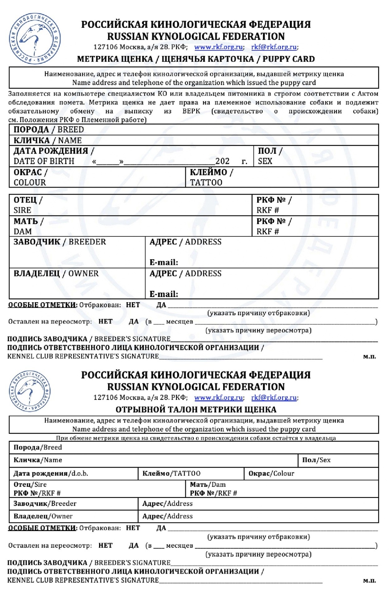 Метрика щенка не дает право на племенное использование собаки и подлежит обязательному обмену на свидетельство о происхождении (родословную) РКФ до ❗ достижения собакой возраста 9 месяцев.❗