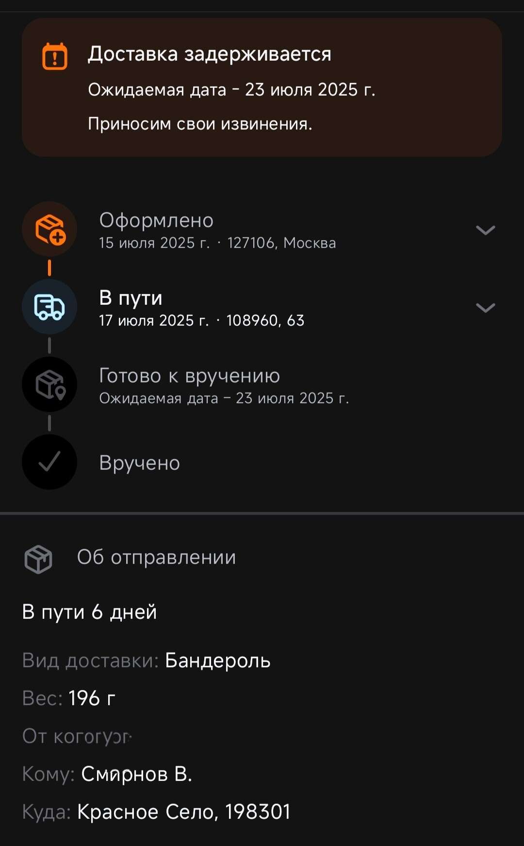15 июля 2025 года нам из Москвы была отправлена очень важная бандероль с документами. На сегодняшний день, 21 июля, отправление находится в пути уже 6 дней, а ожидаемая дата вручения, указанная в системе, сдвинулась на 25 июля 2025 года. То есть, уже наблюдается задержка.